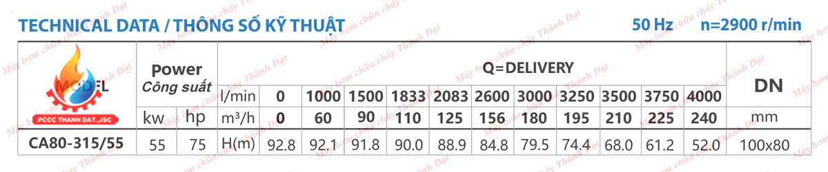 Bảng thông số kỹ thuật của máy bơm chữa cháy Inter CA80-315 75HP
